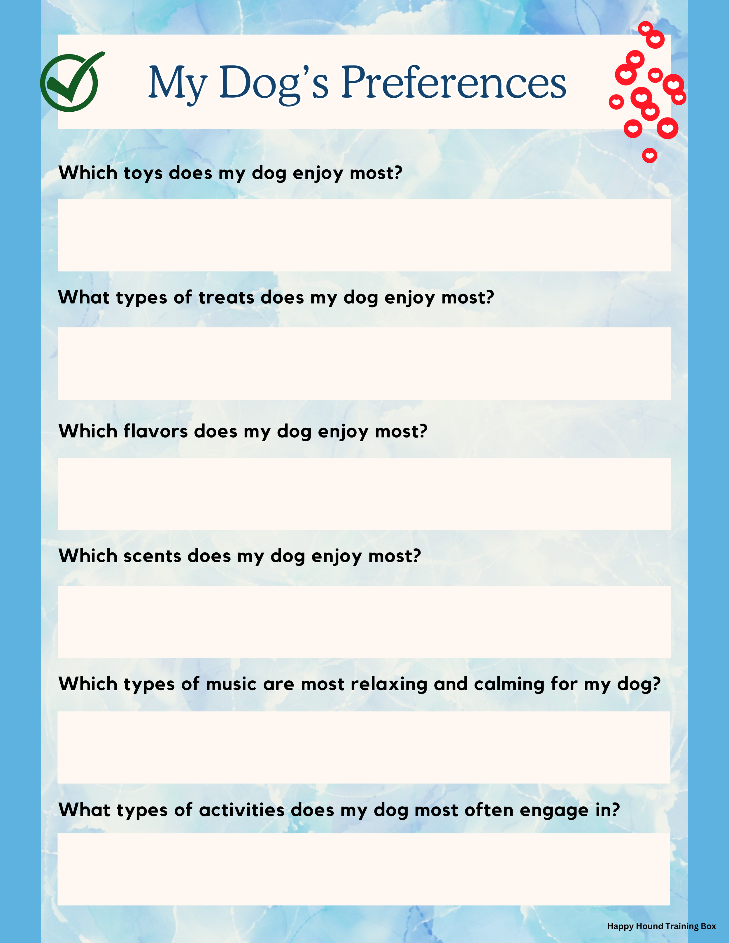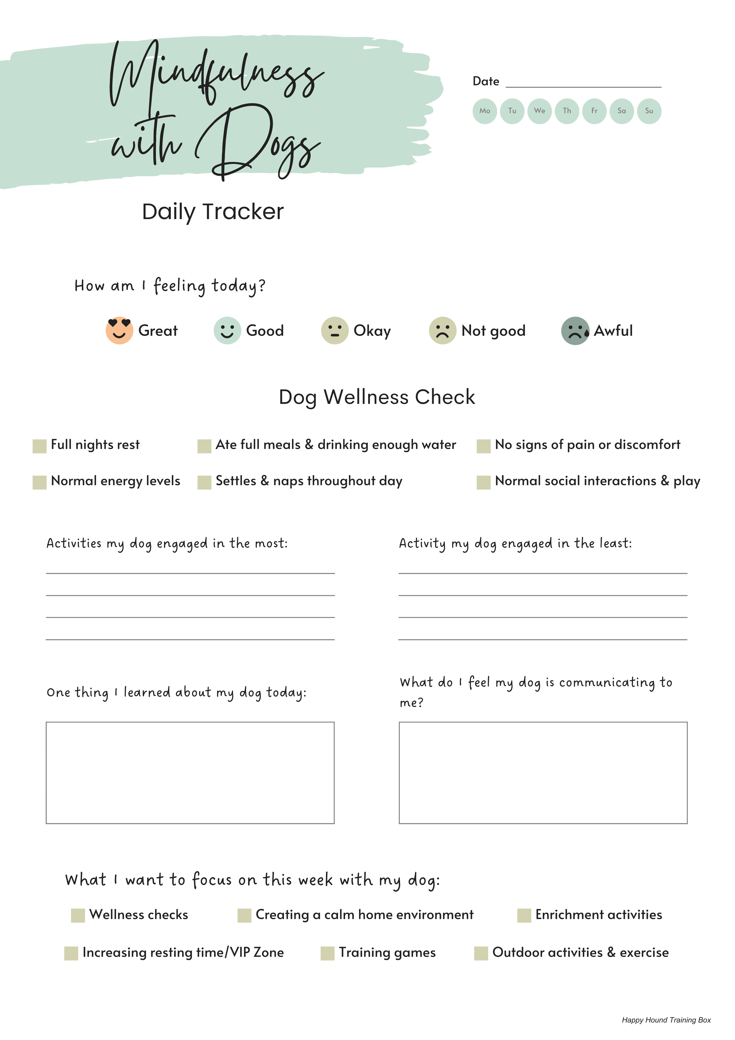 Remember that progress isn’t always linear, and it is more than ok to take breaks whenever you and your dog need one. The goal of these worksheets is to help you identify larger patterns in your dog’s routine and experiences, learn about their preferences, and help support them in areas where they need it.